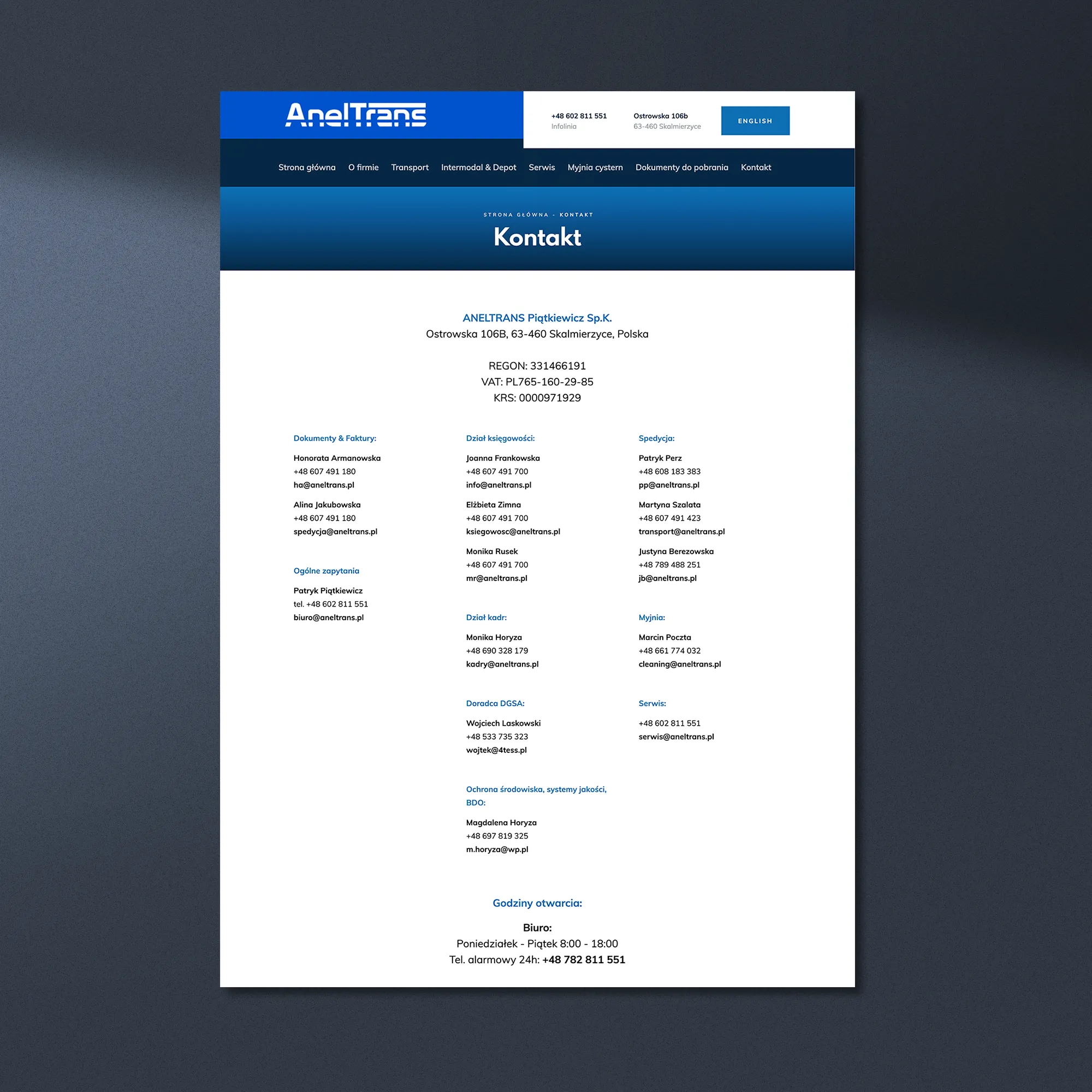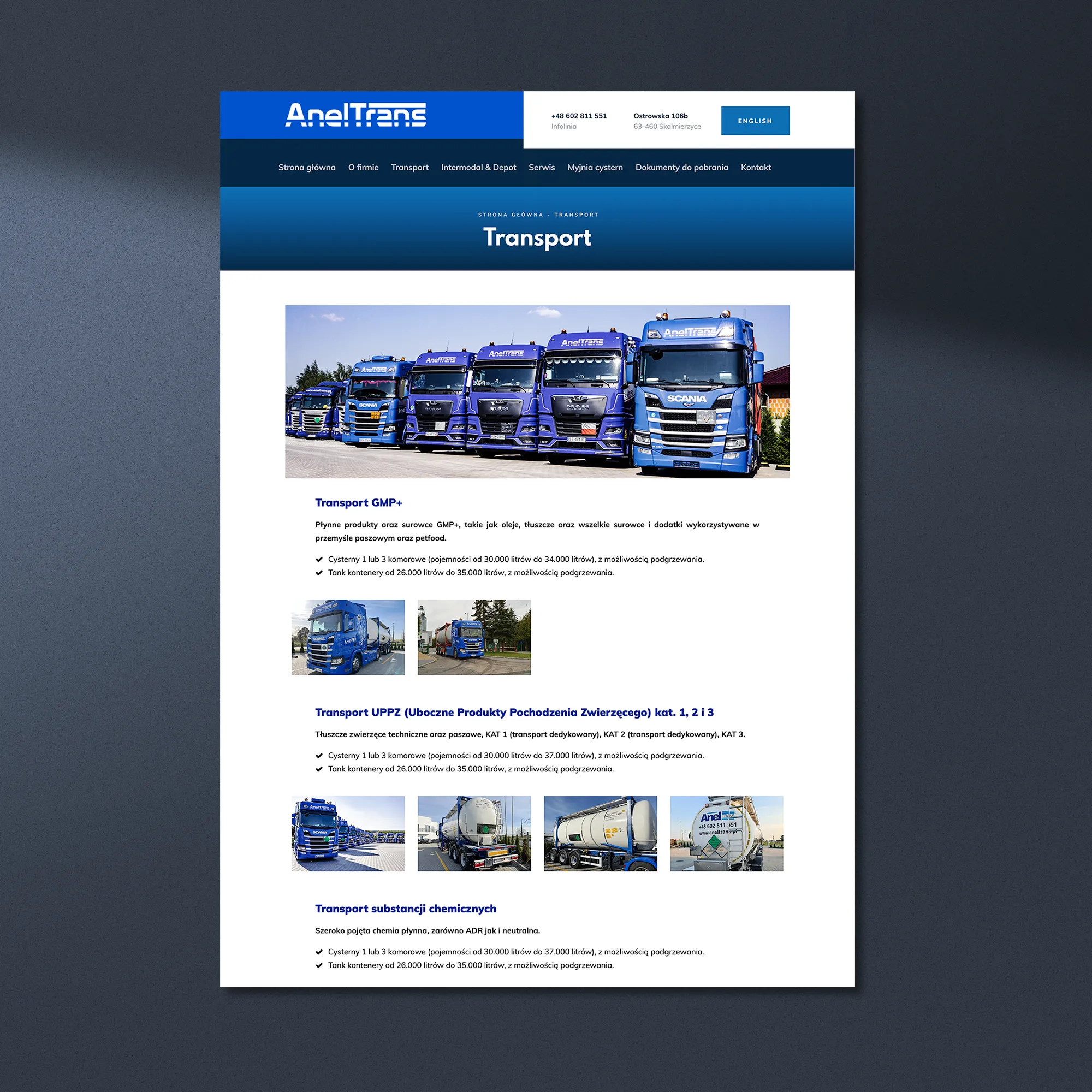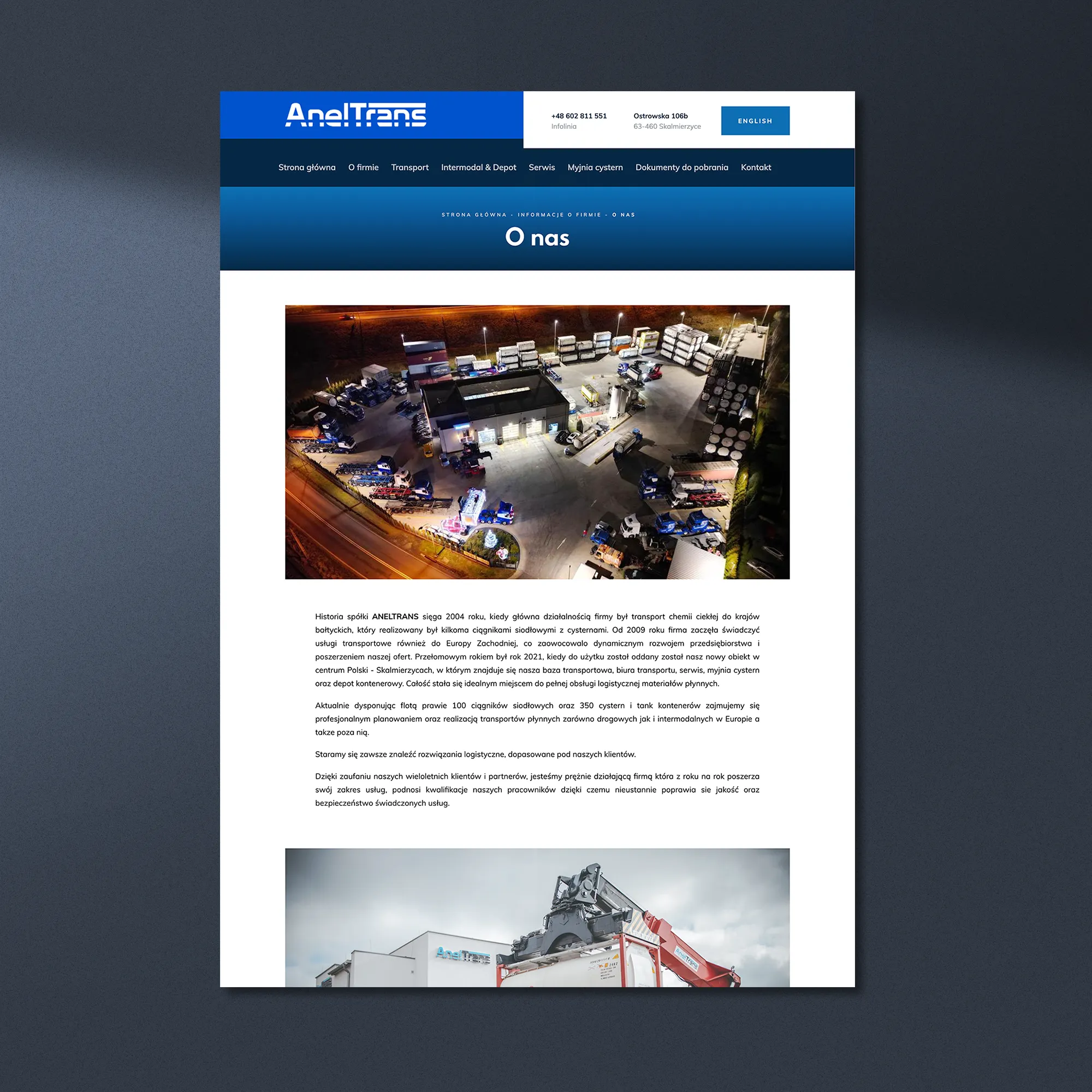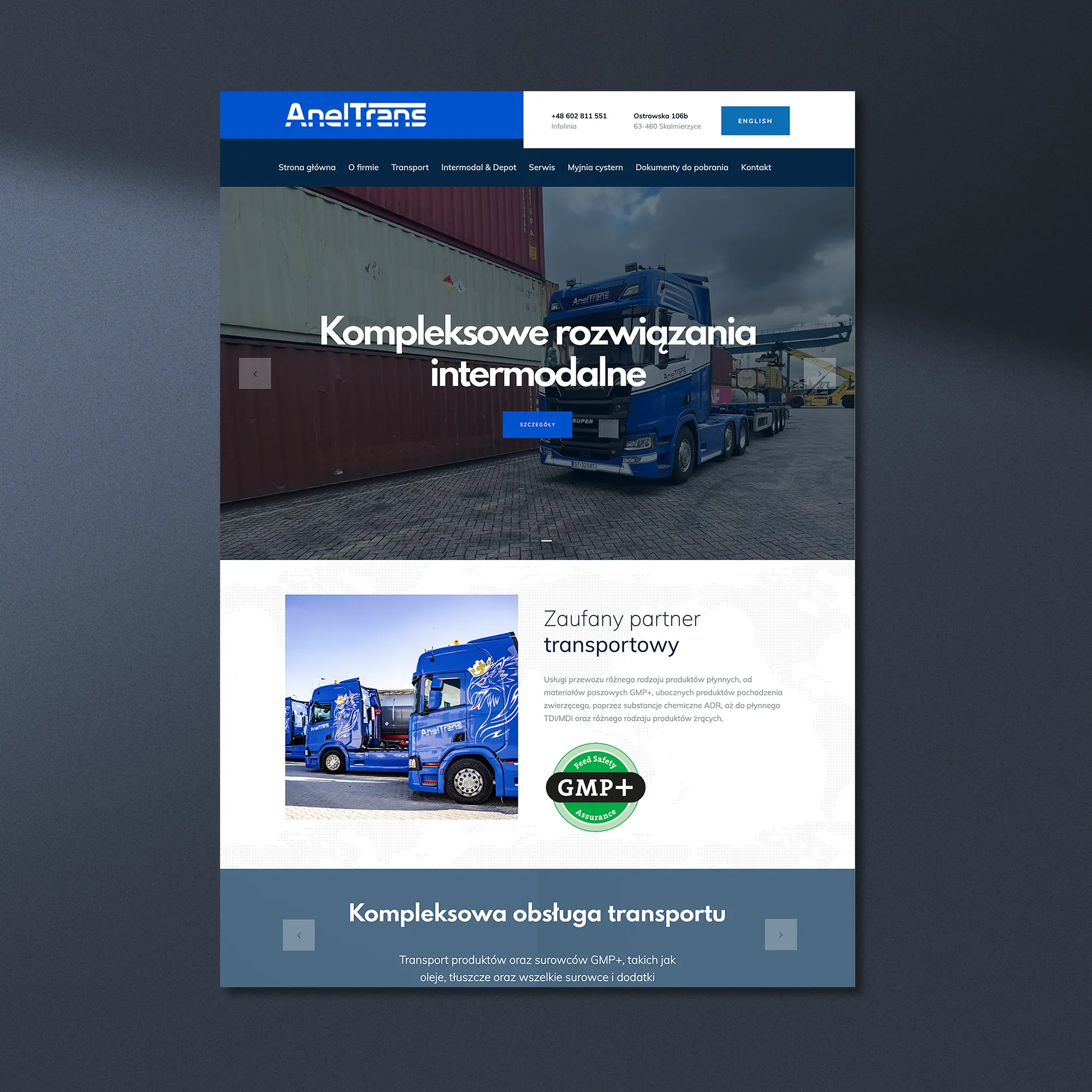 Strona internetowa dla AnelTrans — firmy działającej w obszarze transportu drogowego i intermodalnego materiałów płynnych — została zbudowana w oparciu o nasz autorski framework, co pozwoliło na wdrożenie wysokowydajnych modułów i stabilnej architektury front-endowej. Głównym celem projektu było przygotowanie serwisu, który w przejrzysty sposób odzwierciedli strukturę usług i skalę działalności przedsiębiorstwa.