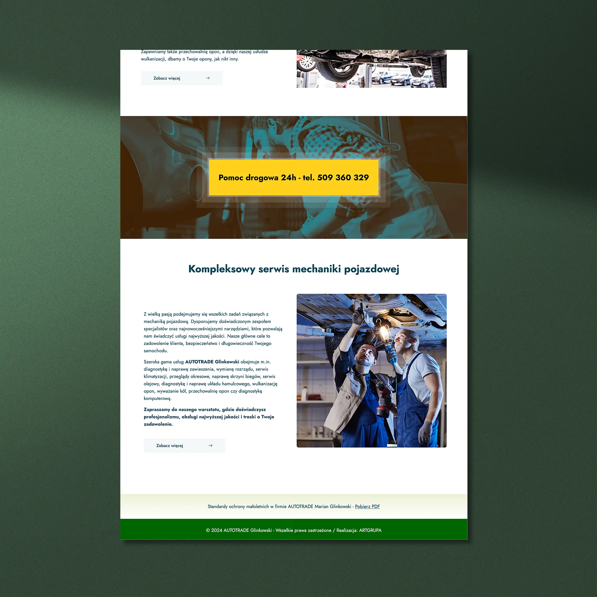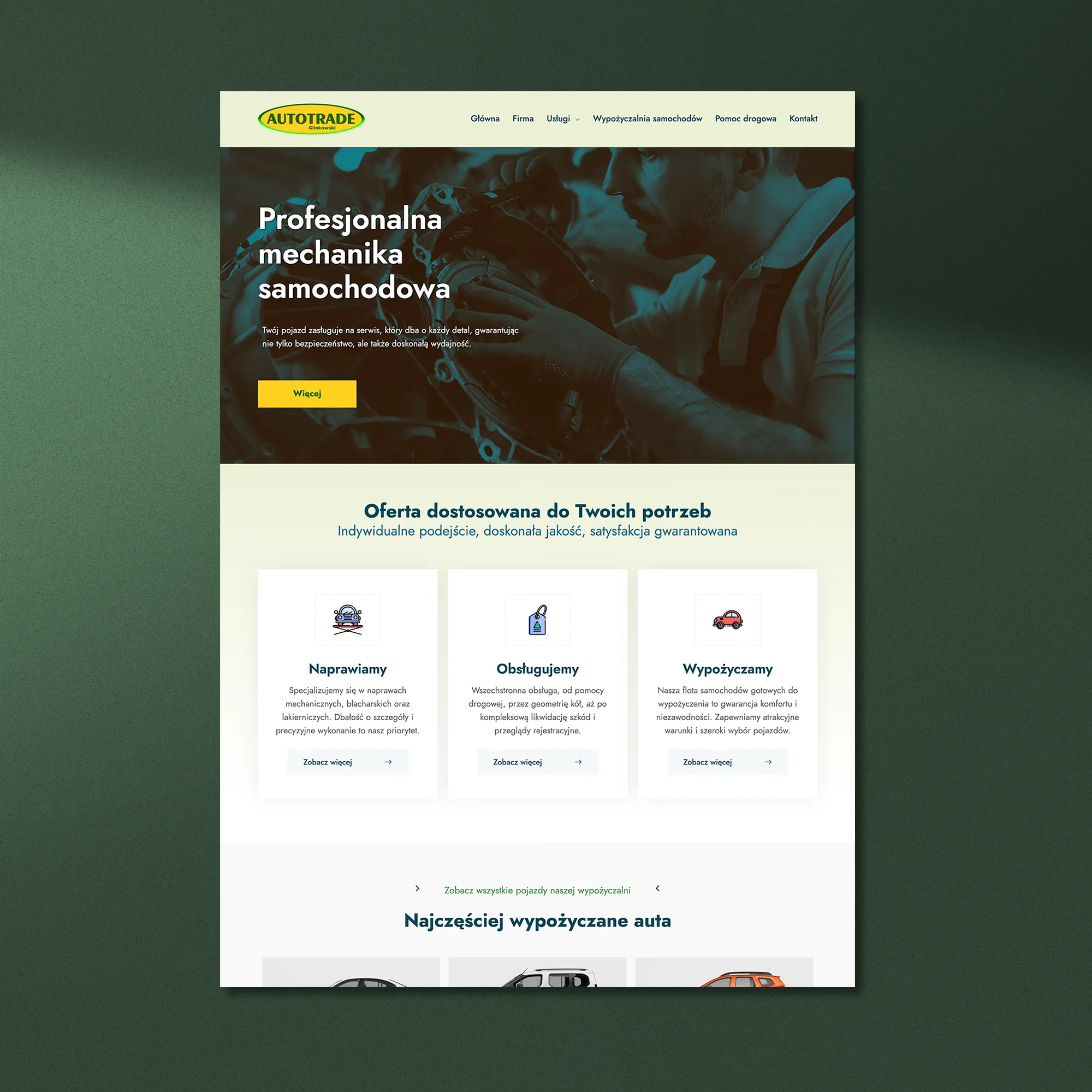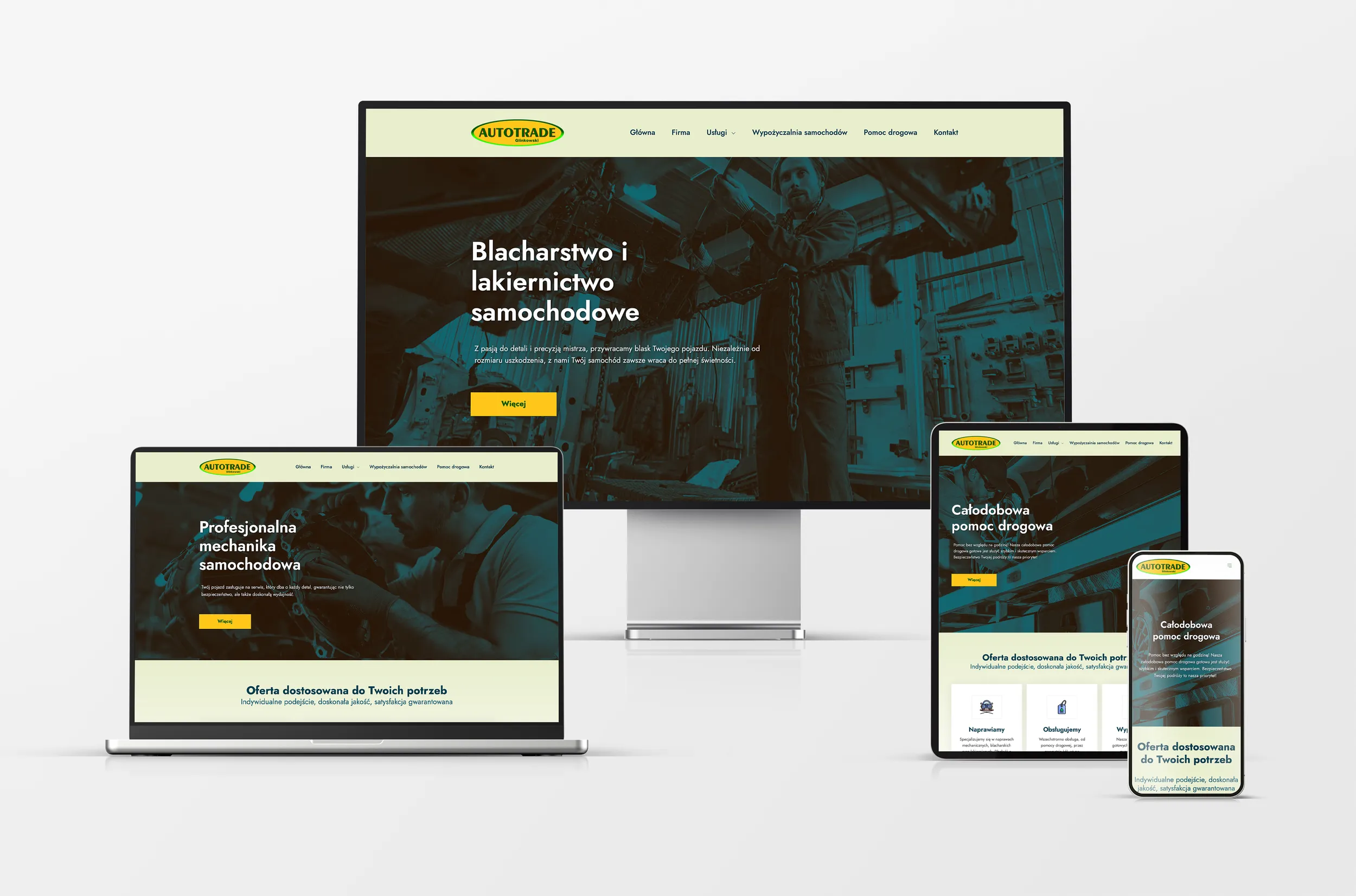 Uzupełniliśmy projekt o profesjonalny copywriting i redakcję treści, aby w sposób spójny i atrakcyjny przedstawić specjalizację firmy, jej doświadczenie oraz rozbudowaną ofertę — od napraw mechanicznych, diagnostyki komputerowej i serwisu klimatyzacji, po blacharstwo, lakiernictwo, likwidację szkód, pomoc drogową 24h oraz przeglądy w ramach stacji kontroli pojazdów. Dzięki nowej stronie AUTOTRADE zyskało nowoczesne narzędzie komunikacji, które podkreśla ich wieloletnie doświadczenie, kompleksową obsługę i wysoki standard usług.