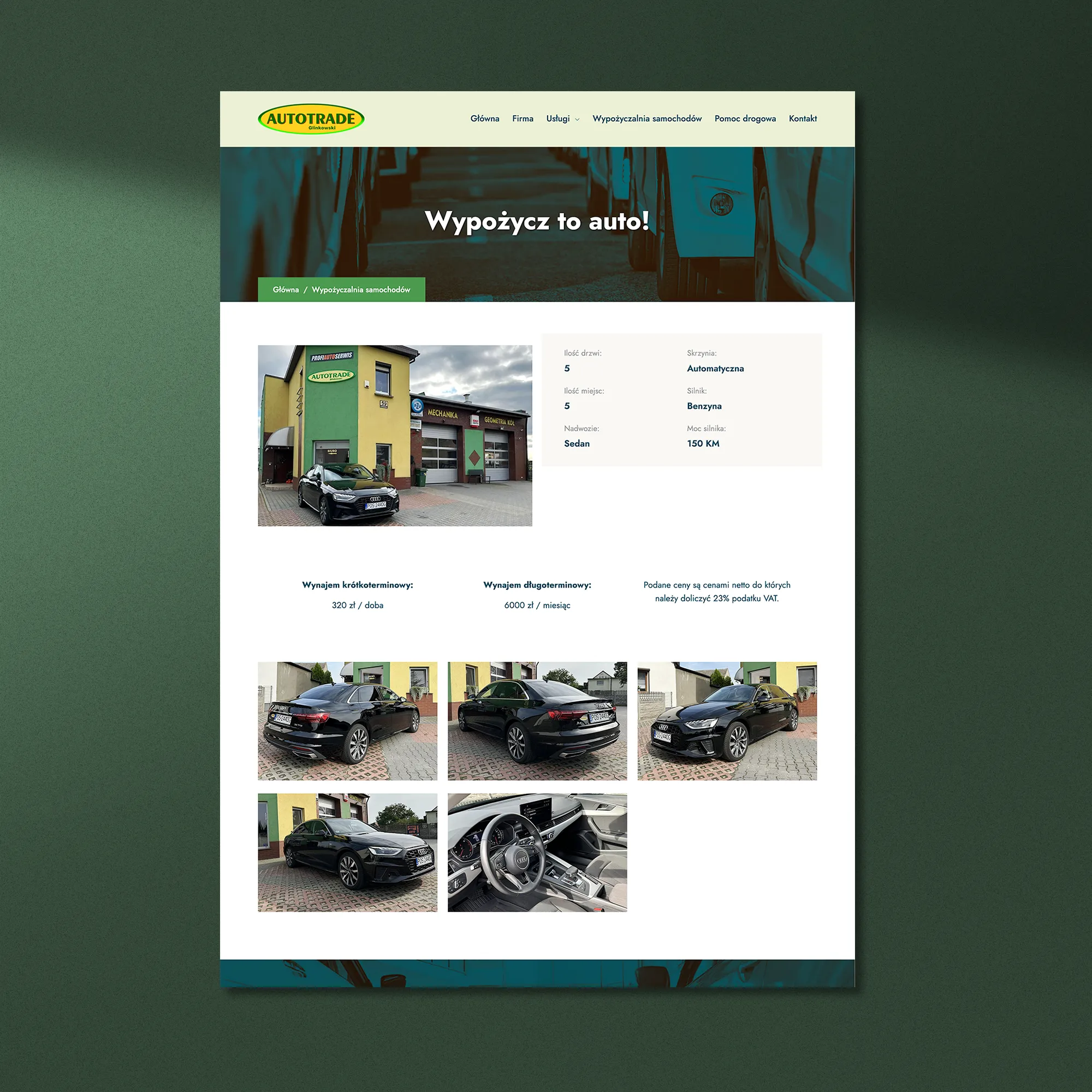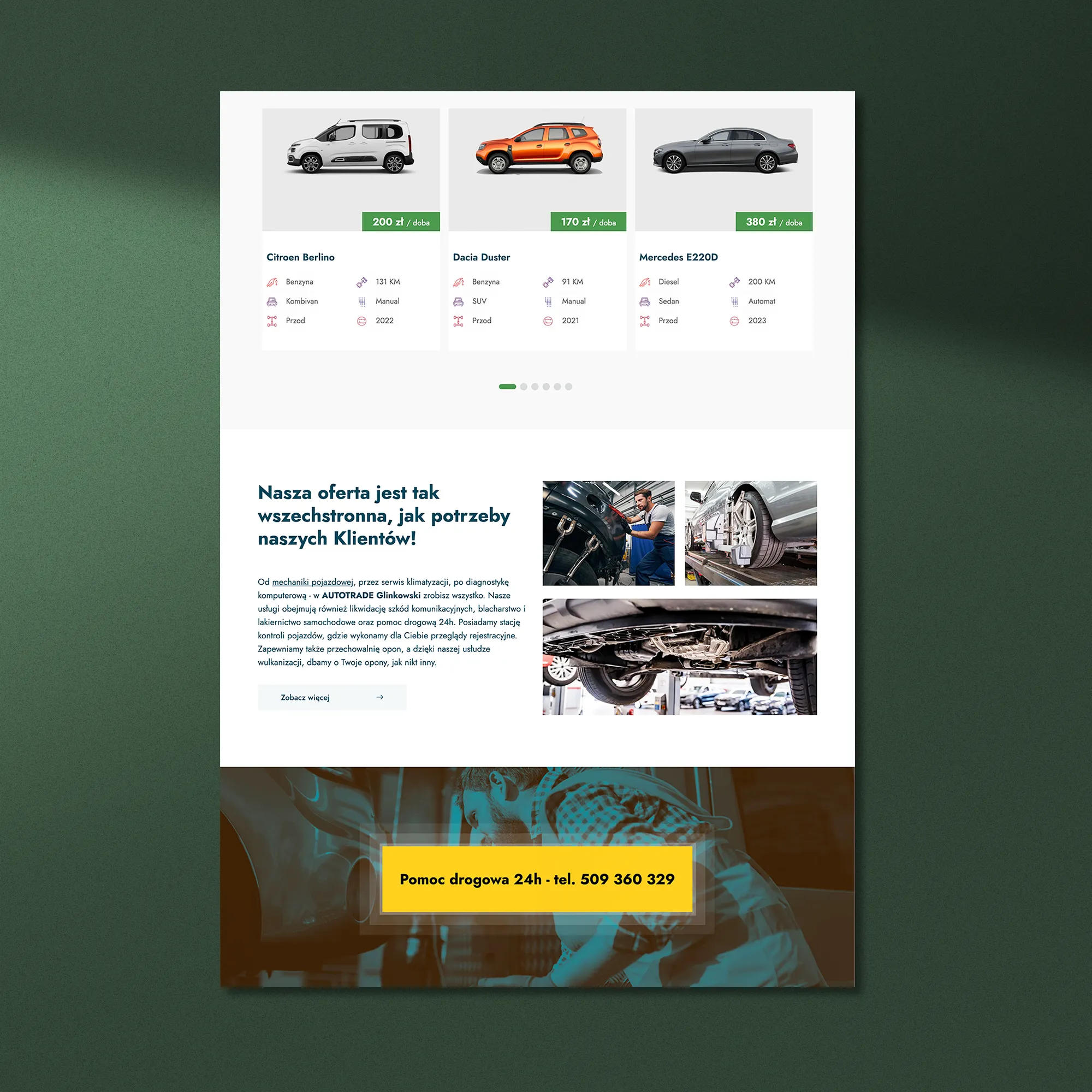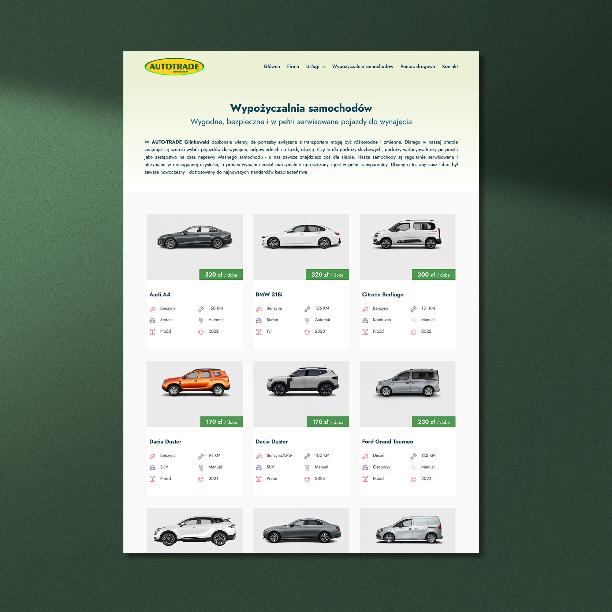 Firma AUTOTRADE Glinkowski, działająca od 1982 roku, zleciła nam przygotowanie nowoczesnej strony internetowej prezentującej pełen zakres usług oraz flotę aut dostępnych do wypożyczenia. Opracowaliśmy kompletny projekt graficzny i UX/UI, a całość została zbudowana w oparciu o dedykowaną architekturę i dostosowana do wszystkich urządzeń, zapewniając pełną responsywność oraz intuicyjną nawigację.