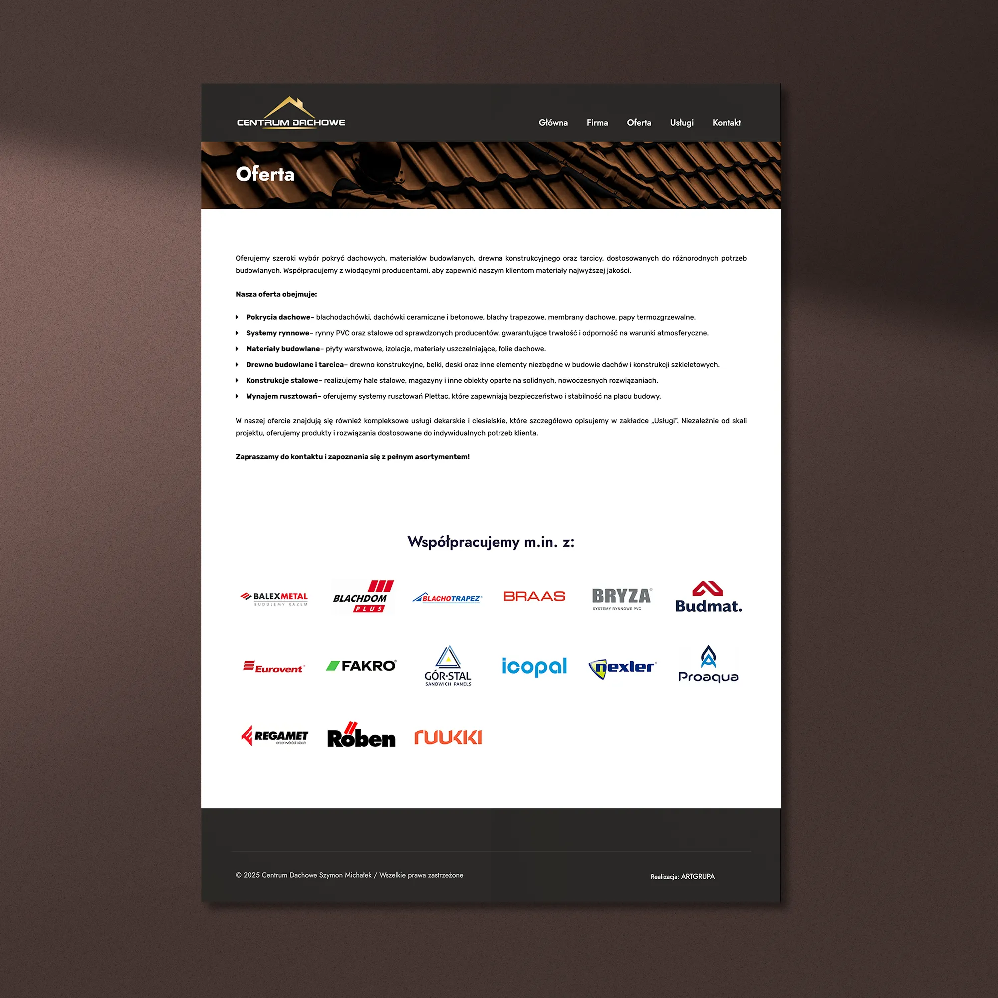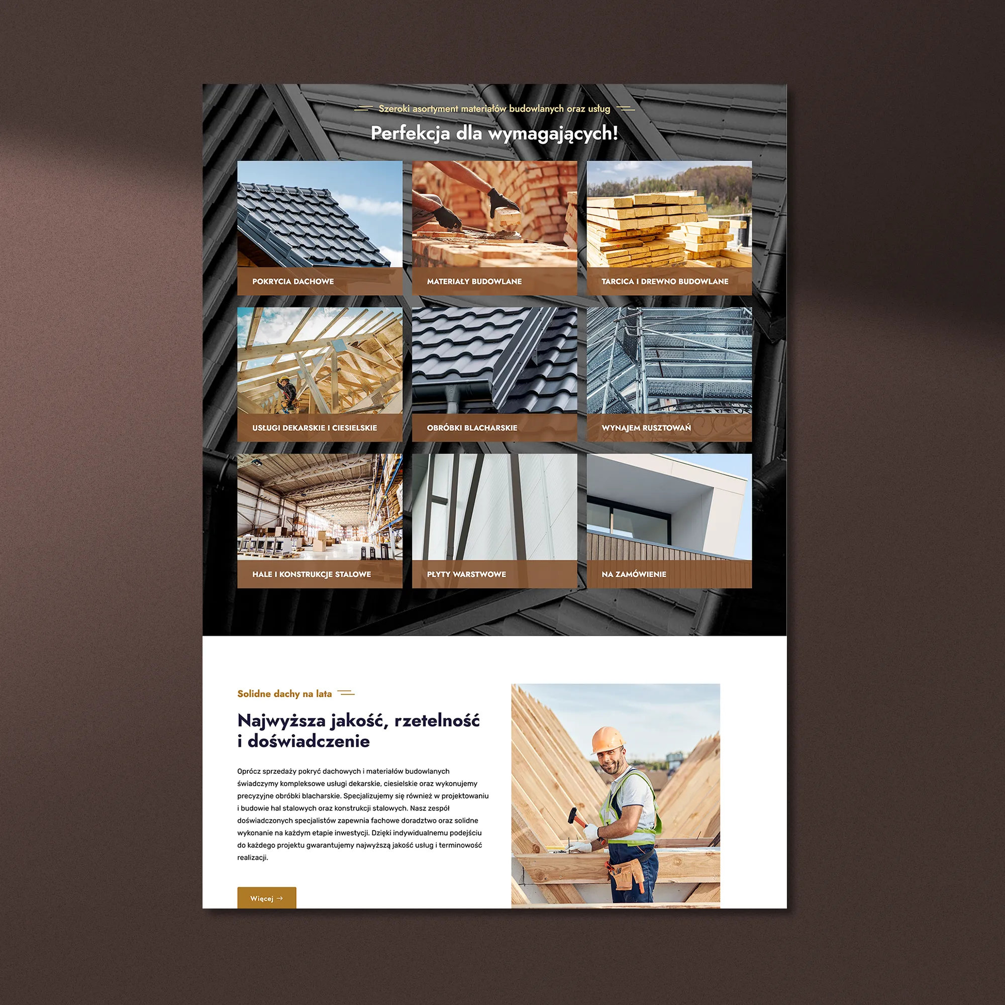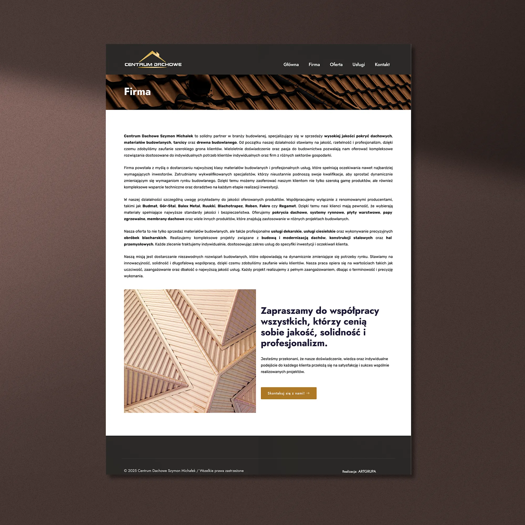 W ramach realizacji przygotowaliśmy również copywriting i redakcję tekstów, tak aby w rzetelny sposób zaprezentować zakres działalności firmy, jej doświadczenie, ofertę materiałów budowlanych oraz specjalistycznych usług dekarskich, ciesielskich i blacharskich. Strona podkreśla profesjonalny profil Centrum Dachowego i ułatwia klientom indywidualnym oraz firmowym szybkie zapoznanie się z bogatą ofertą oraz wartościami, na których firma buduje swoją markę.