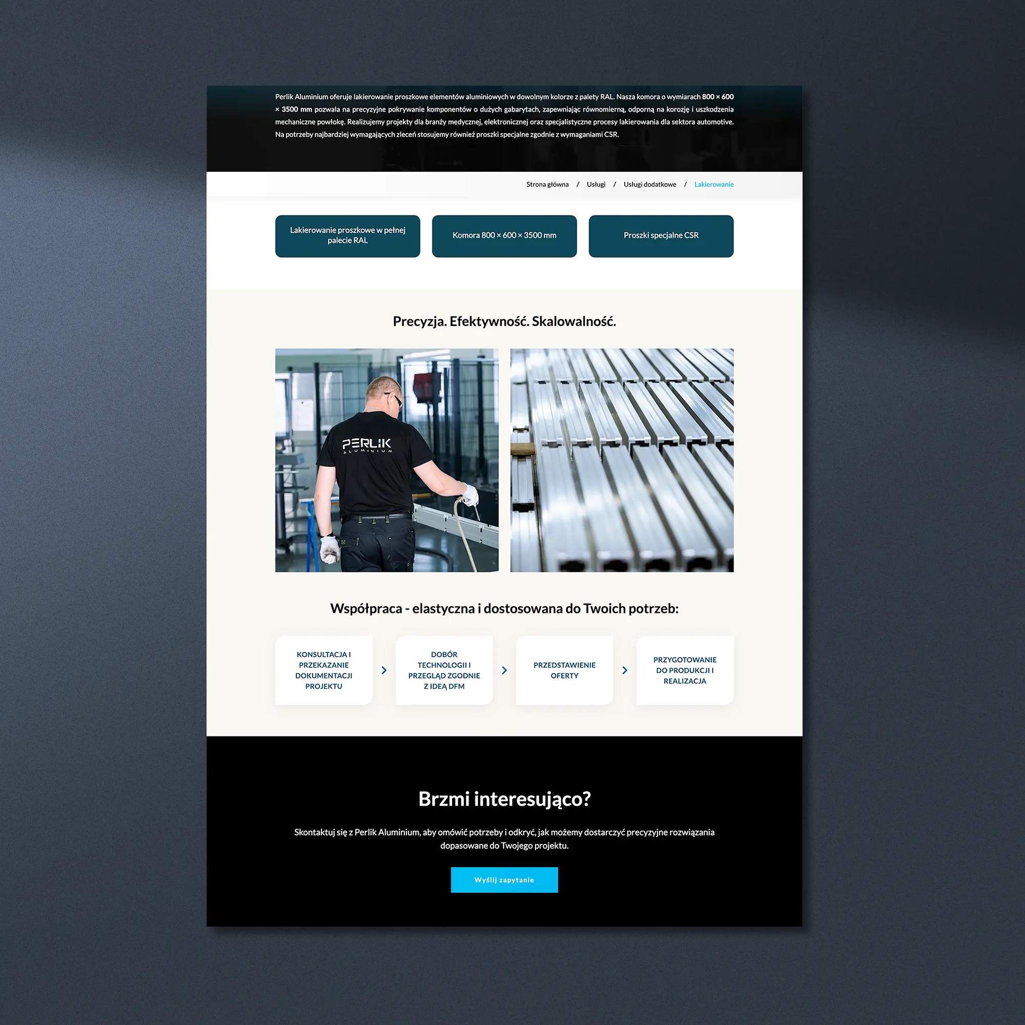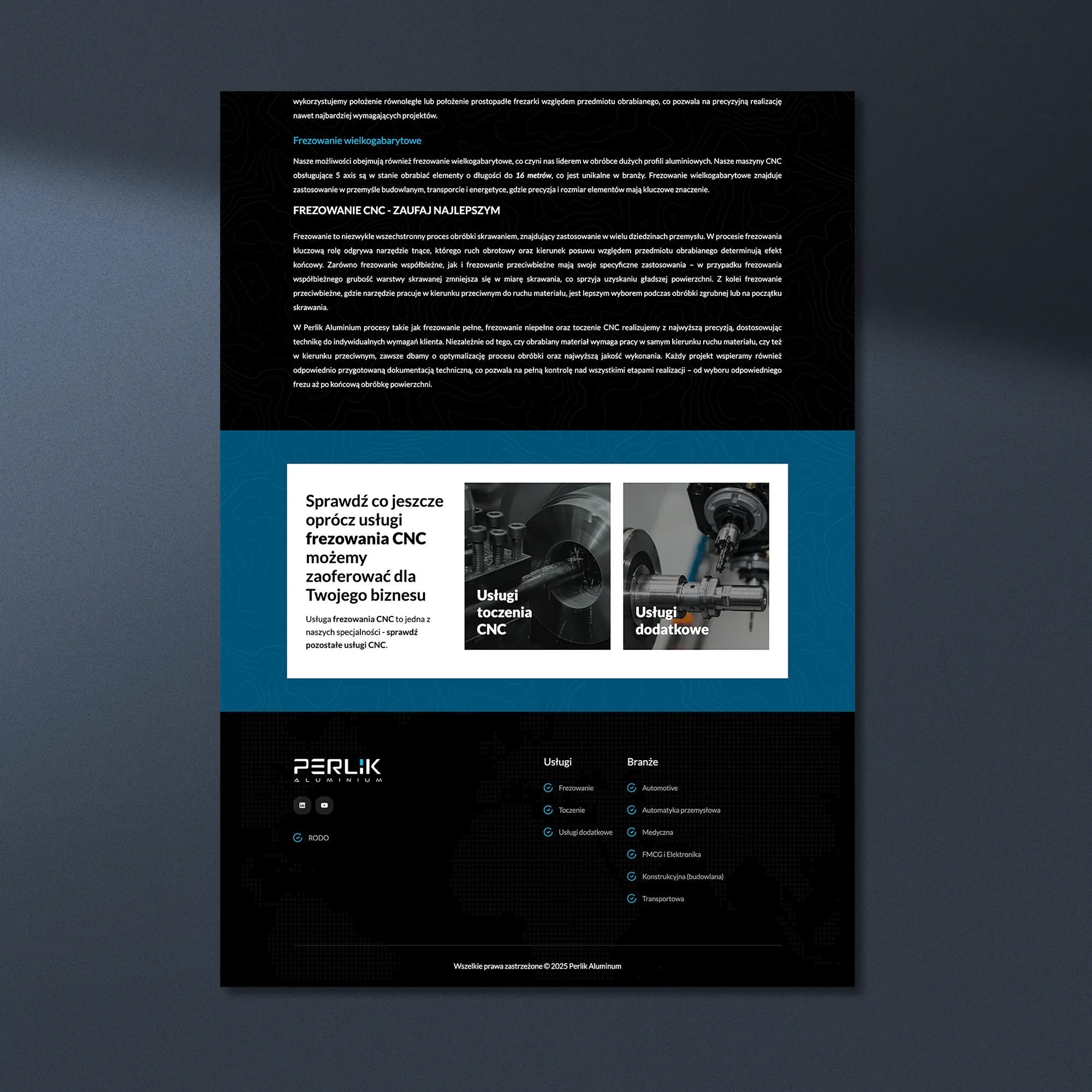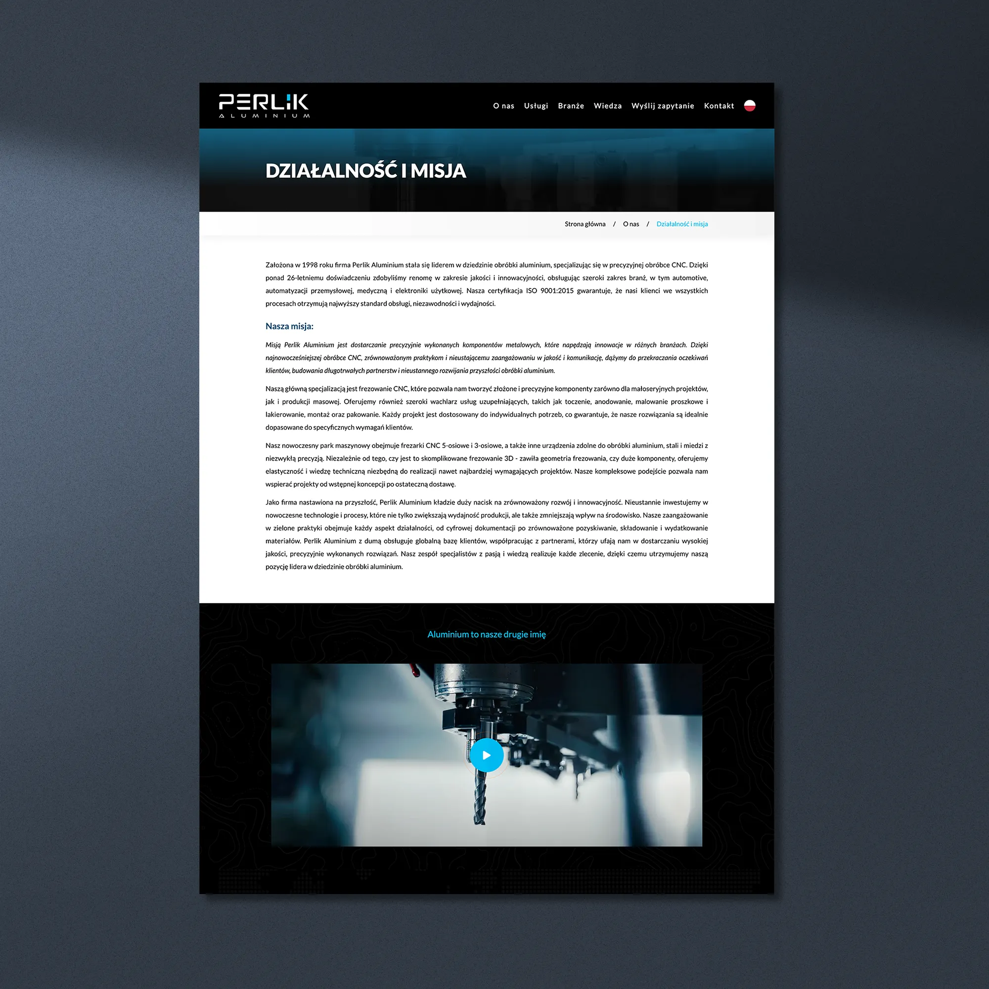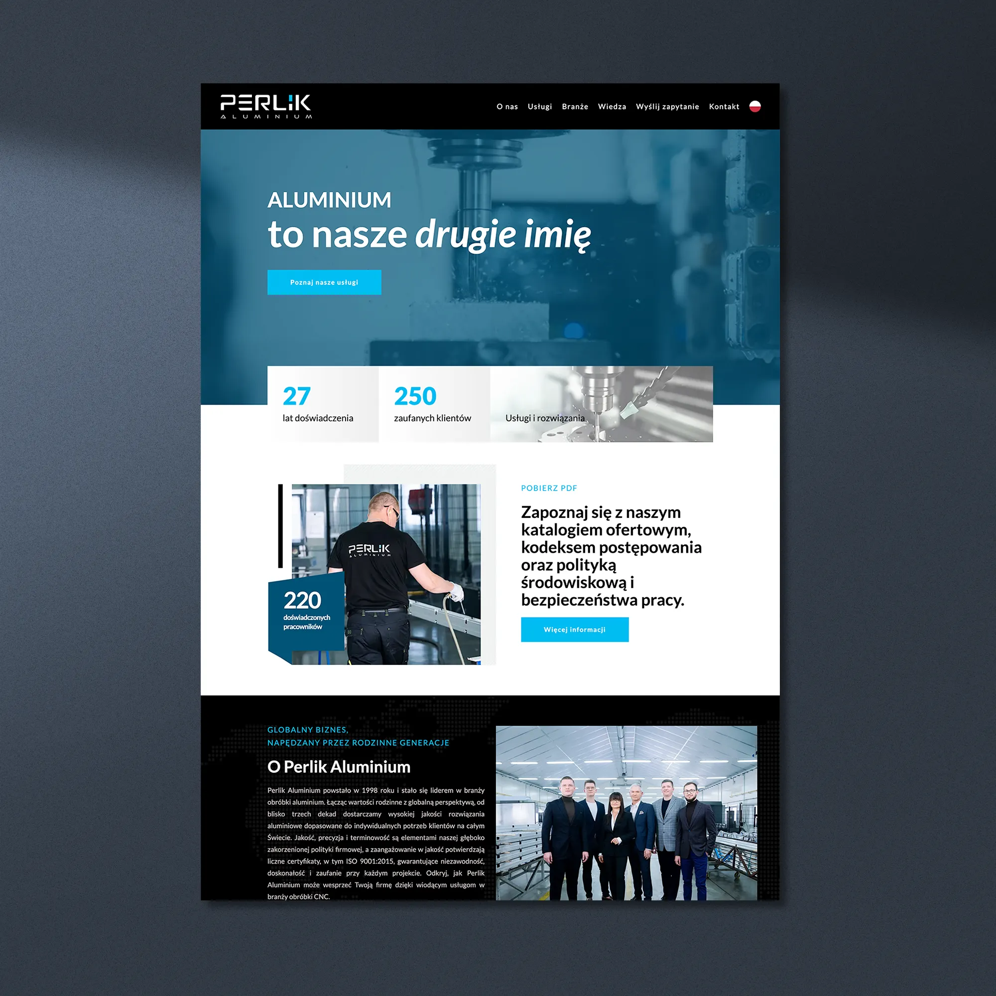 Strona internetowa dla Perlik Aluminium — firmy specjalizującej się w obróbce CNC komponentów aluminiowych — powstała w oparciu o nasz autorski framework, co umożliwiło zastosowanie zoptymalizowanych modułów i wysoką wydajność przy rozbudowanej strukturze treści. Projekt zakładał stworzenie narzędzia, które w klarowny sposób przedstawi procesy technologiczne, zakres usług oraz przewagi techniczne przedsiębiorstwa.