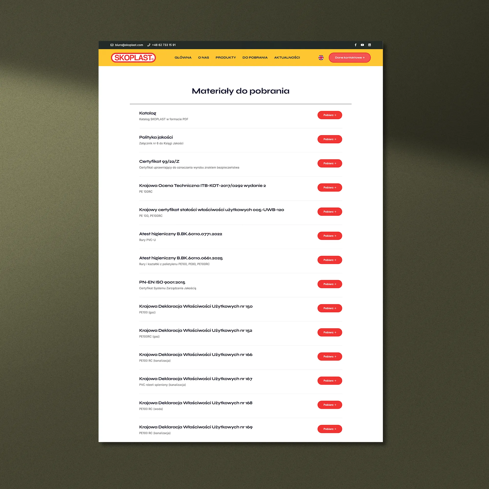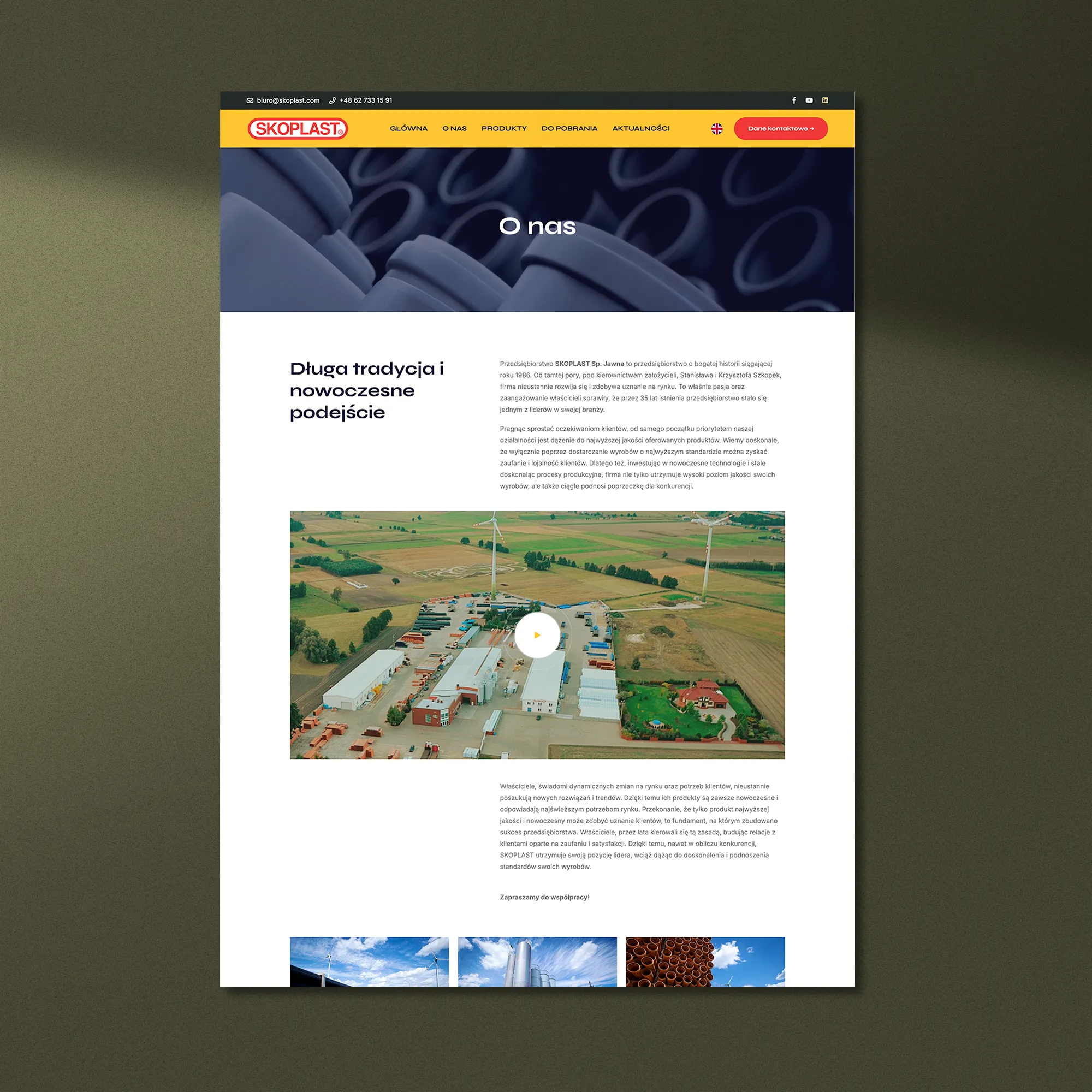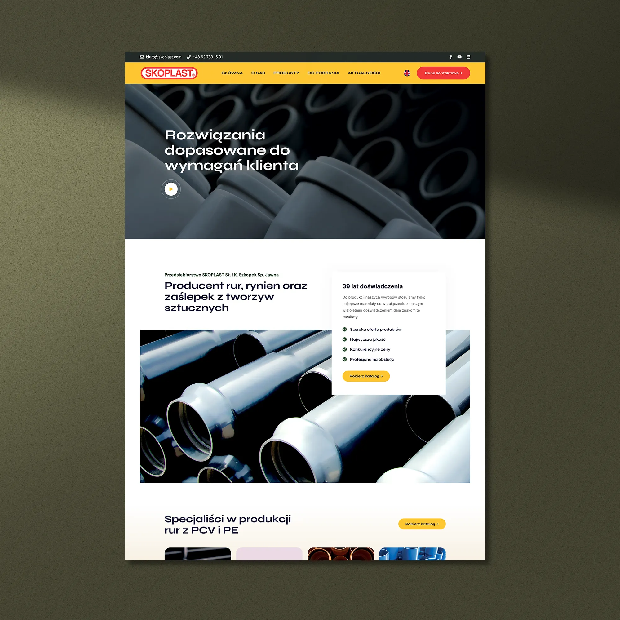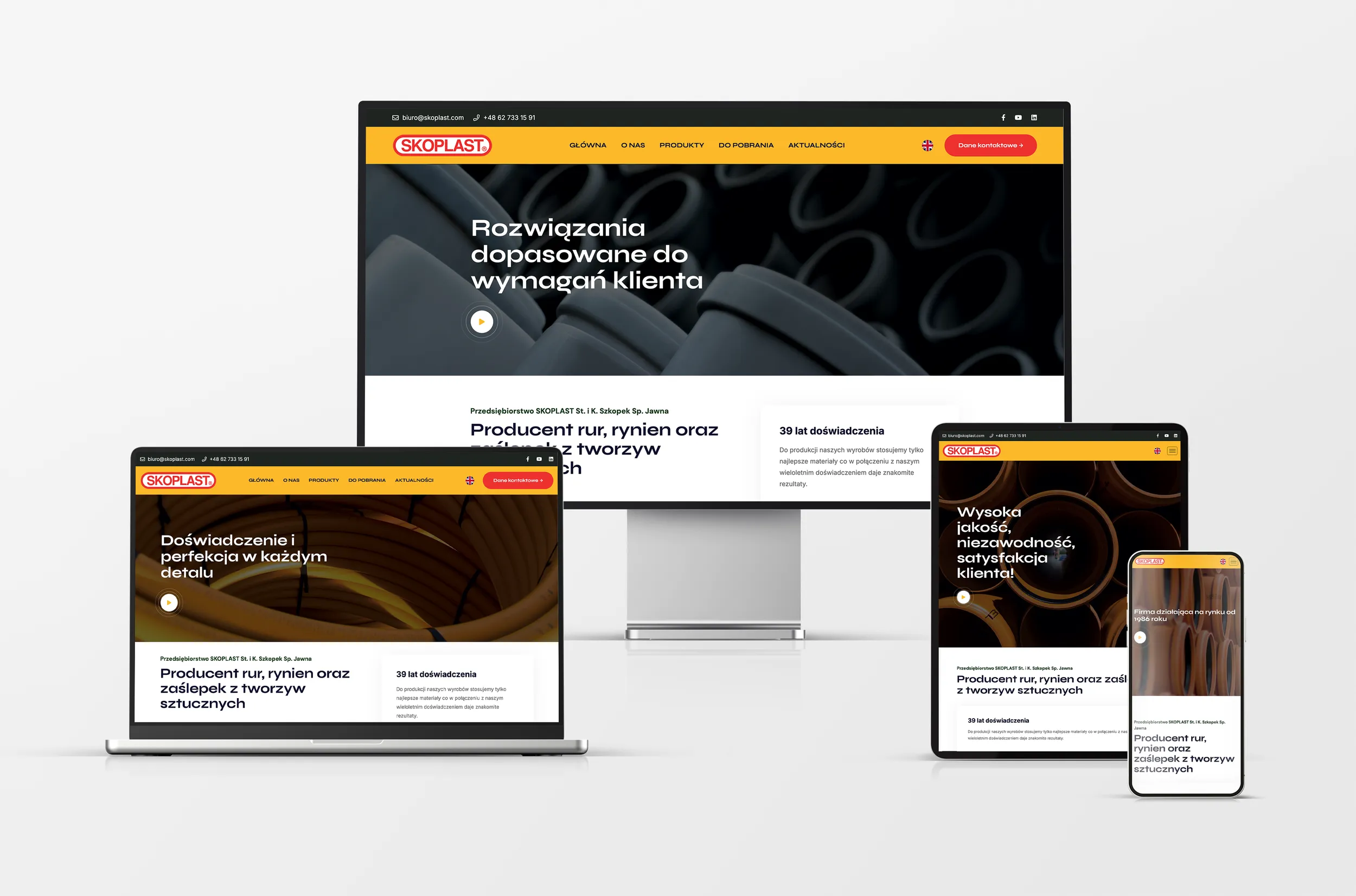 Przedsiębiorstwo SKOPLAST, działające nieprzerwanie od 1986 roku, powierzyło nam kompleksowe opracowanie swojej nowej obecności w internecie. Stworzyliśmy rozbudowaną stronę internetową opartą na dedykowanej architekturze, zaprojektowaną od podstaw pod kątem UX/UI, z pełnym dostosowaniem do urządzeń mobilnych oraz obsługą dwóch wersji językowych wraz z tłumaczeniami. Dzięki temu firma może skutecznie komunikować swoją ofertę zarówno na rynku krajowym, jak i zagranicznym.