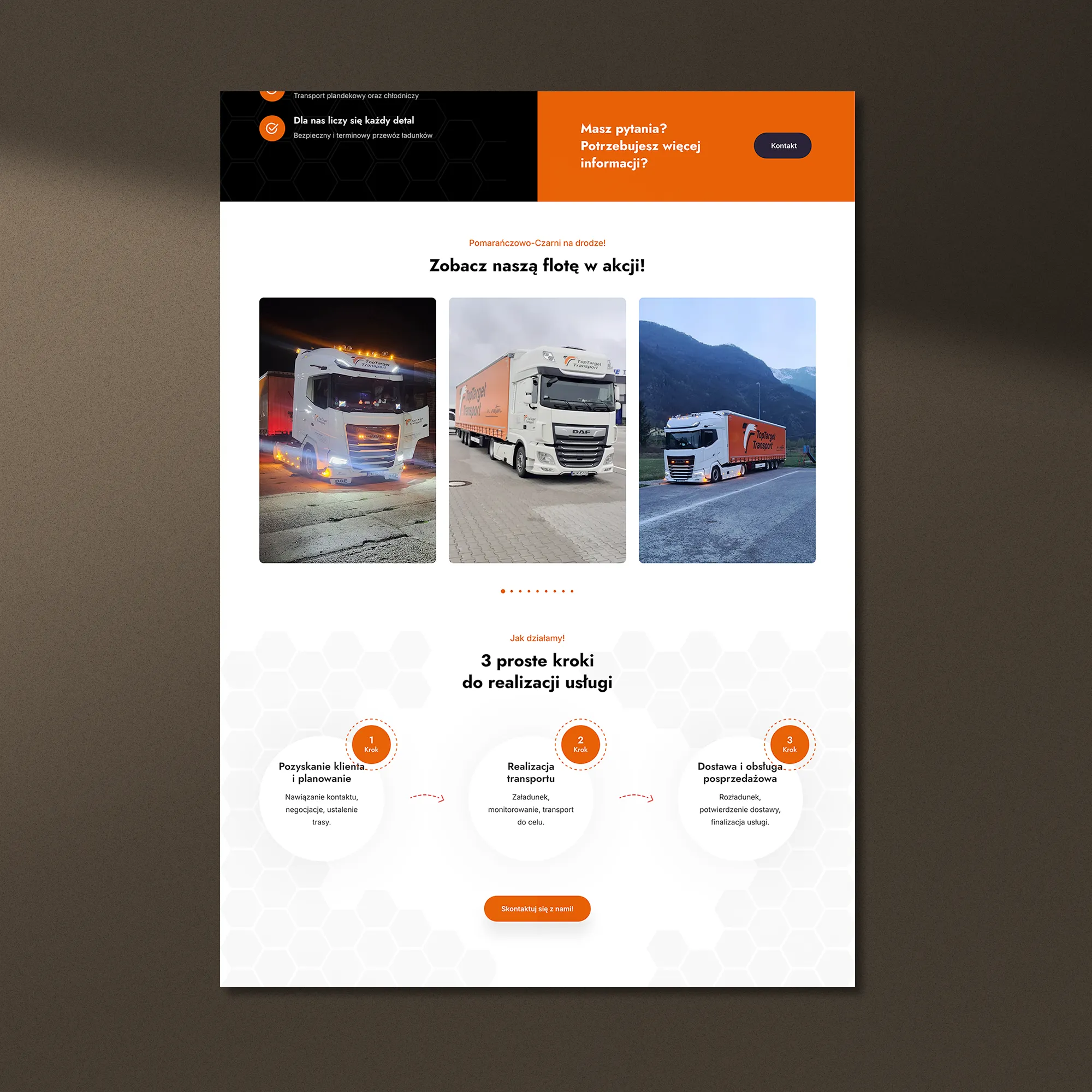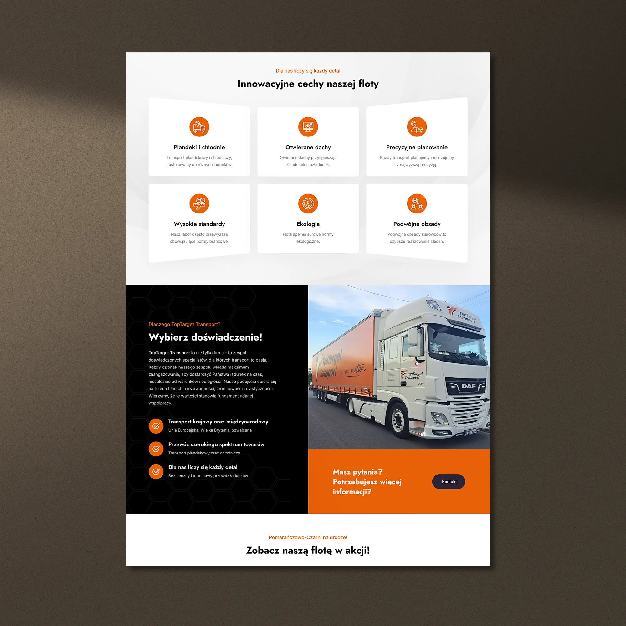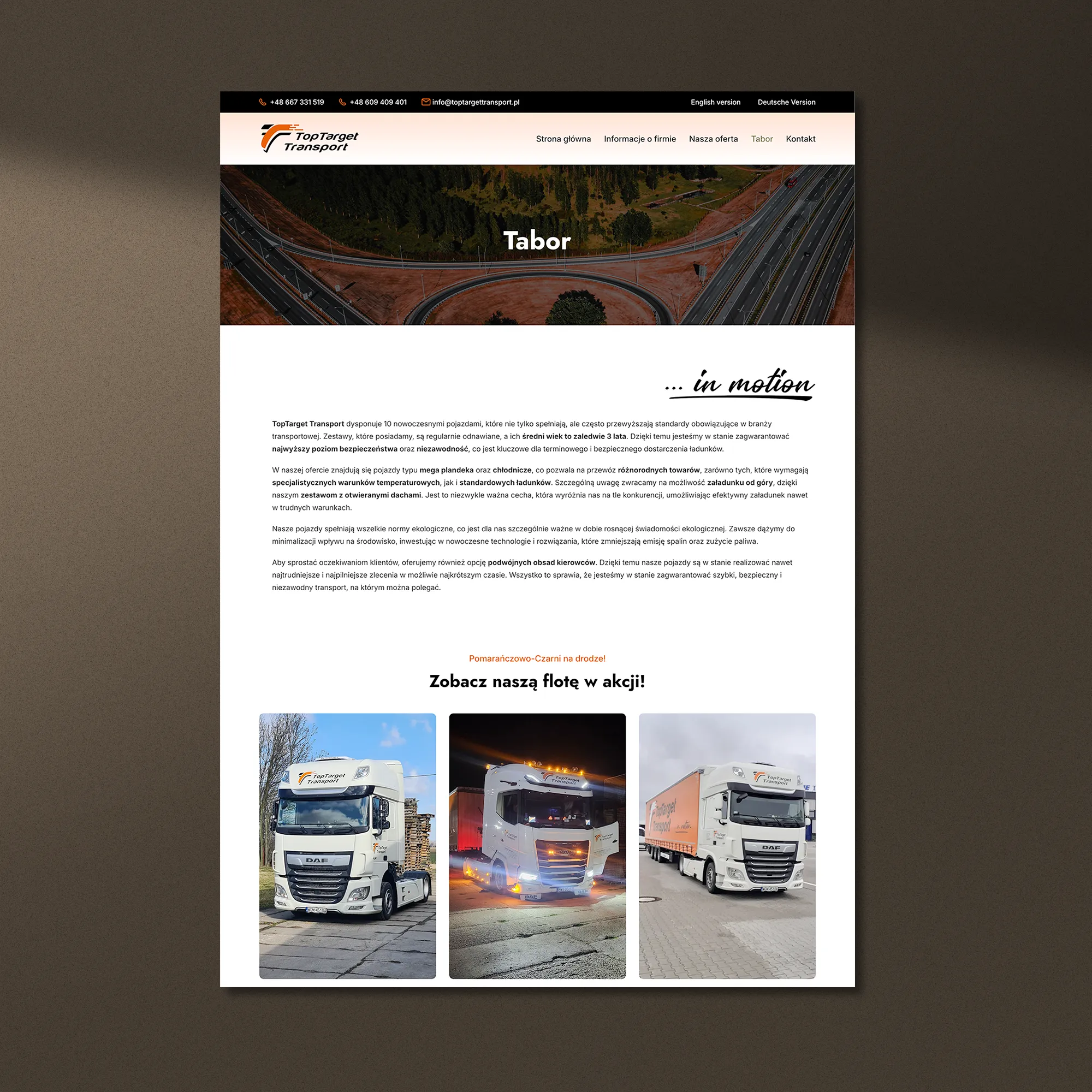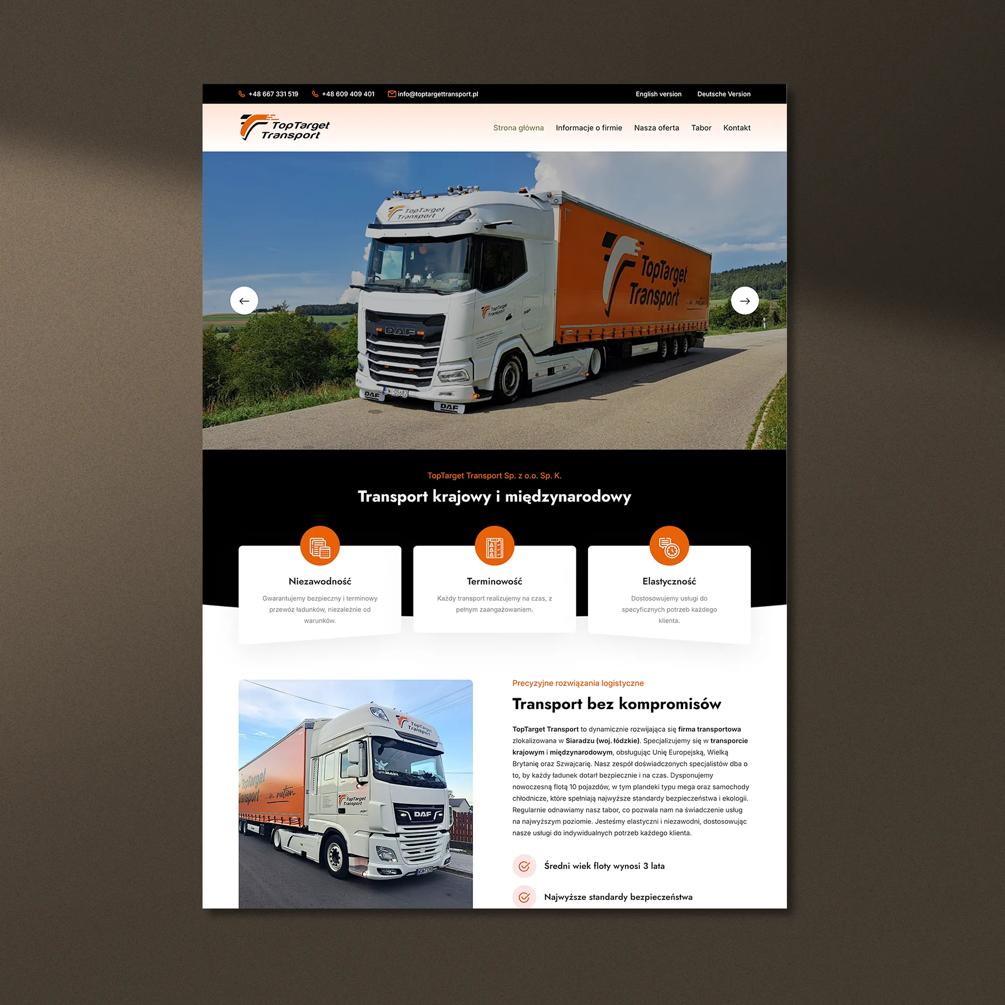 Realizacja dla TopTarget Transport — firmy świadczącej usługi transportu krajowego i międzynarodowego — obejmowała przygotowanie nowej witryny internetowej zbudowanej na naszym autorskim frameworku, co zapewniło wysoką wydajność działania, stabilność oraz możliwość rozbudowy o kolejne moduły. Serwis został zaprojektowany tak, aby w sposób uporządkowany prezentować zakres usług przewozowych i przewagi operacyjne przedsiębiorstwa.