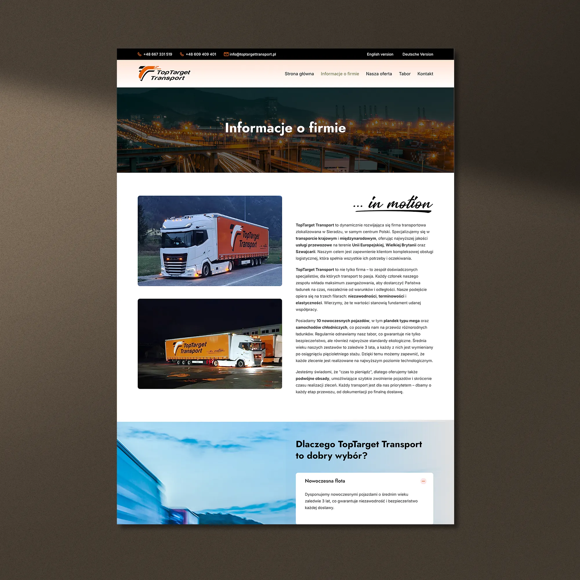 Wdrożyliśmy trzy wersje językowe: polską, angielską i niemiecką, wraz z tłumaczeniami dostosowanymi do branży TSL. Mechanizm wielojęzyczności został zintegrowany bezpośrednio ze strukturą frameworka, co ułatwia aktualizację treści oraz umożliwia skalowanie witryny na kolejne rynki. Dzięki temu strona w każdej wersji językowej zachowuje spójny układ interfejsu i przejrzystość komunikacji.